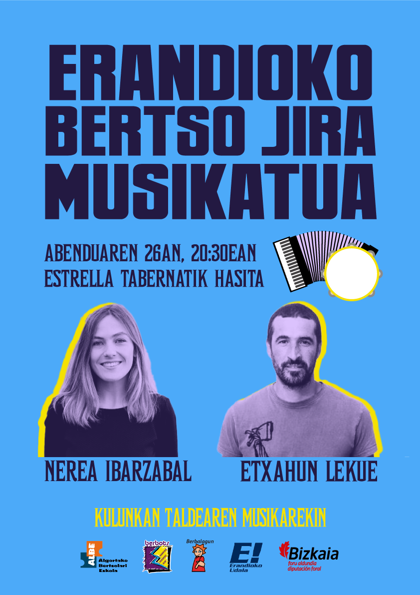 Agendan dagoeneko finkatuta dagoen saioa da Erandioko bertso jira musikatua, Berbotsekin batera antolatuta. Aurten, abenduaren 26an, Nerea Ibarzabal eta Etxahun Lekue bertsolariak izango ditugu kantuan, 20:30ean Estrella tabernatik hasita. Musika Kulunkan taldeko kideek jarriko dute. Anima zaitez, bertsozale, eta erdu gurekin!
