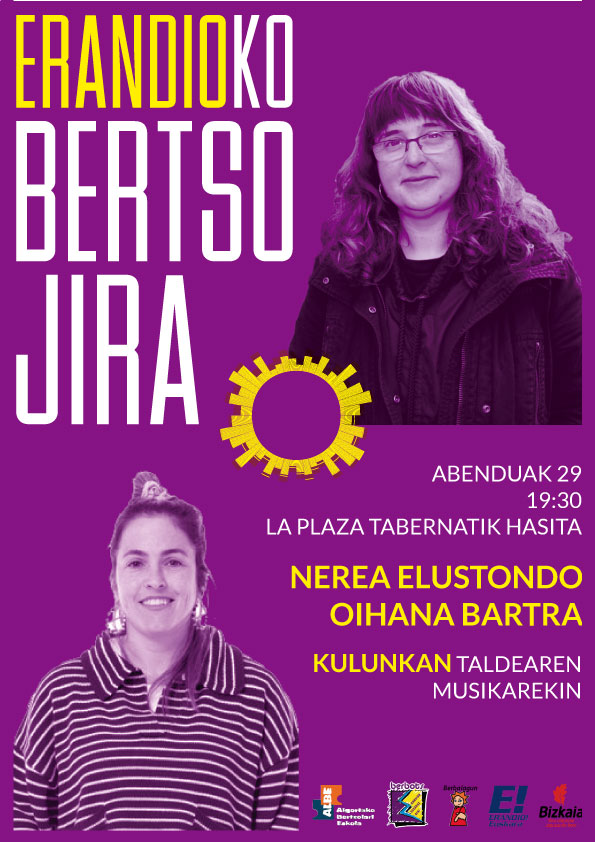 Erandioko bertso jira musikatua 2022 Eguna: abenduaren 29a Ordua: 19:30 Tokia: La Plaza tabernatik hasita Bertsolariak: Nerea Elustondo eta Oihana Bartra Erandioko bertso jira nerea elustondo Oihana Bartra