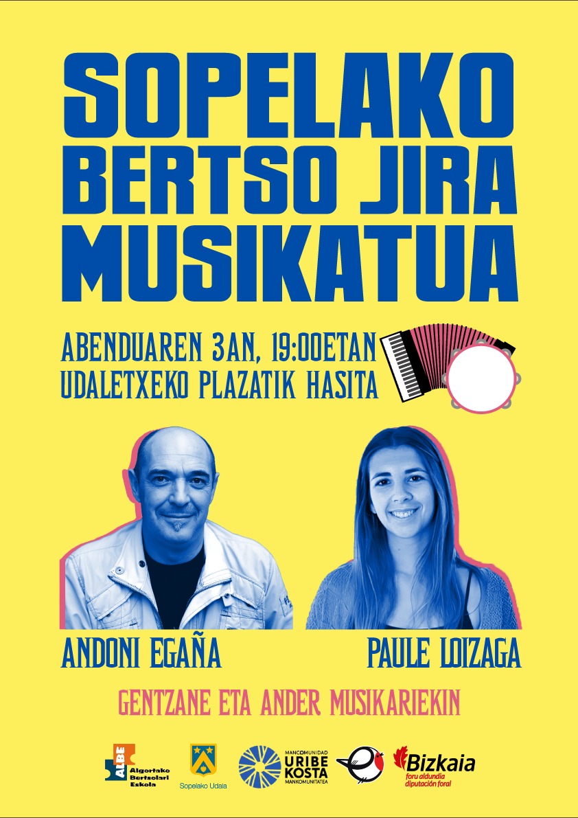 Aurten ere, bertso jira musikatua Sopelara bueltatu da. Abenduaren 3an, 19:00etan, Paule Loizaga eta Andoni Egaña bertsolariak kantuan izango ditugu tabernaz taberna, udaletxeko plazatik hasita. Gentzane Fernandez eta Ander Trabudua musikariek saioa girotzen lagunduko dute. Anima zaitez!