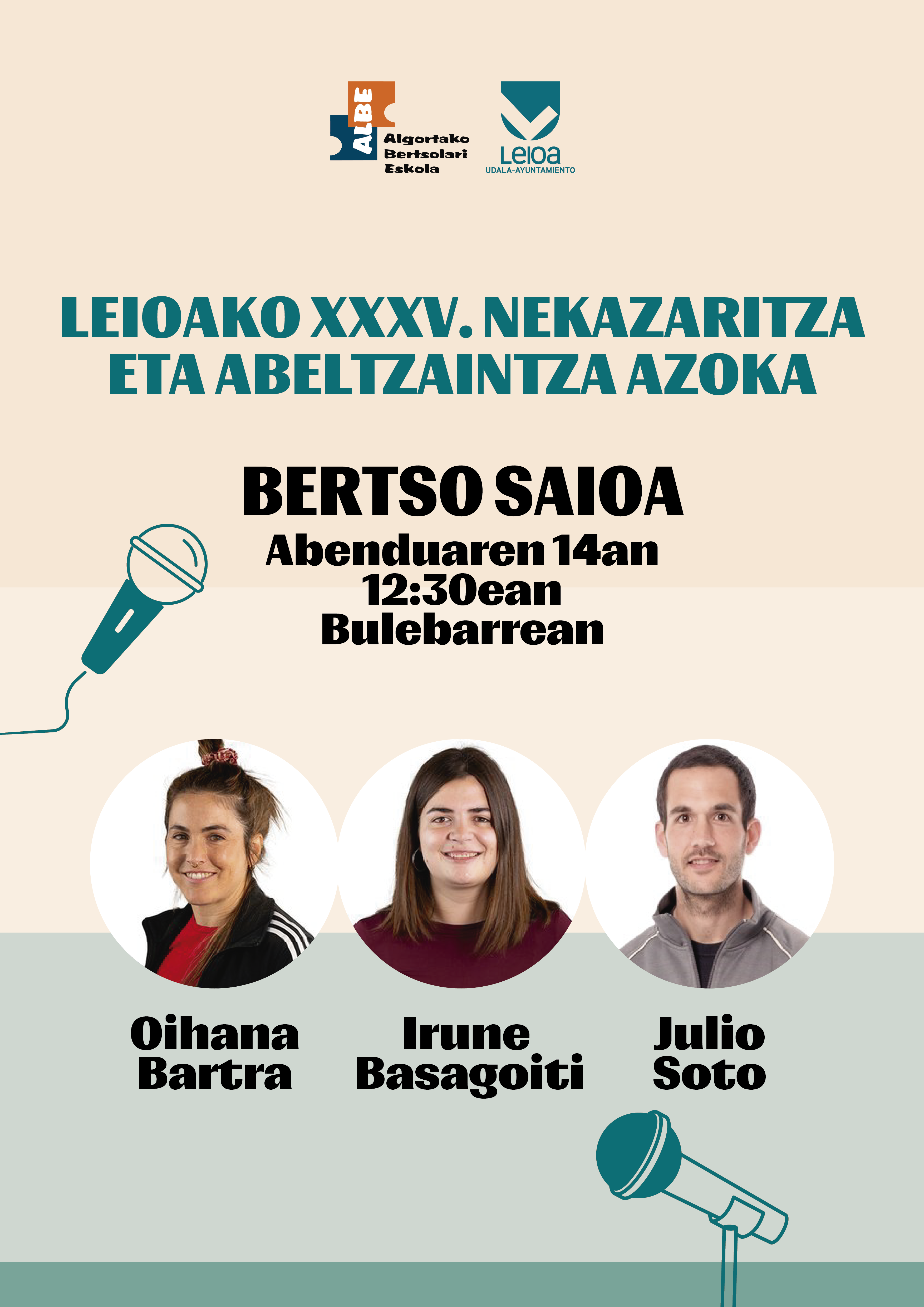 Igandean, abenduaren 14an, urtero lez nekazaritza eta abeltzaintza azoka izango dugu Leioan. Gure lurreko produktuak eskainiko dituzten postuen artean, 12:30ean, bulebarreko eszenatokian, kantuan arituko dira Oihana Bartra, Irune Basagoiti eta Julio Soto bertsolariak. Anima zaitezte!