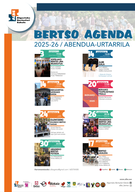 Abendutik urtarrilera Uribe Kostan egingo diren bertso ekitaldien berri bertsozaleei ematea da agenda honen helburua. Bat egin gurekin eta parte hartu bertsozaleon interes eta atseginerako prestatu ditugun ekimenetan. Hilabeteok bertsoz bete-beteak datoz, gorde datak zuen egutegietan!