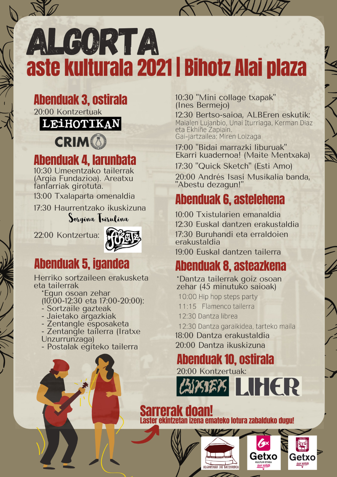Abenduaren 3tik 10era bitartean Algortako aste kulturala antolatu dute Algortako jai batzordeko kideek. Biotz Alai plazan egingo dira egunetako kontzetu, tailer eta bestelakoak. Bertso saioa abenduaren 5ean izango da, igandean, 12:30ean. Maialen Lujanbio, Unai Iturriaga, Kerman Diaz eta Ekhiñe Zapiain bertsotan arituko dira Miren Loizagaren gidaritzapean.